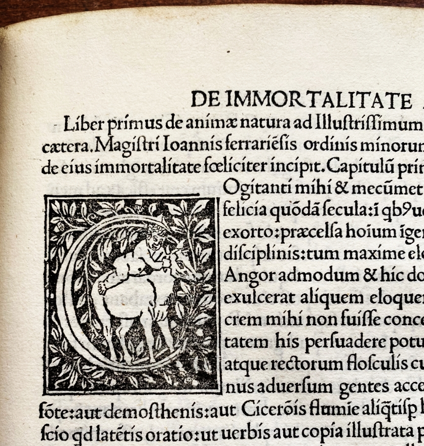 27. (INCUNABLE). FERRARIENSIS, Johannes Liber noviter editus. De celesti vita. In quo infrascripta continentur. In primis. De natura Anime rationalis. De immortalitate Anime. De inferno et cruciatu Anime. De paradyso et felicitate Anime. (Also known as De Coelesti vita et de animarum immortalitate).