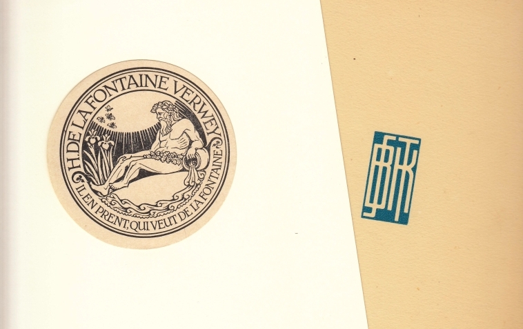 Los inliggend een (opgeplakt) origineel exlibris van Herman de la Fontaine Verwey, mooi zinnebeeldig, rond, naar ontwerp van S.H. de Roos.