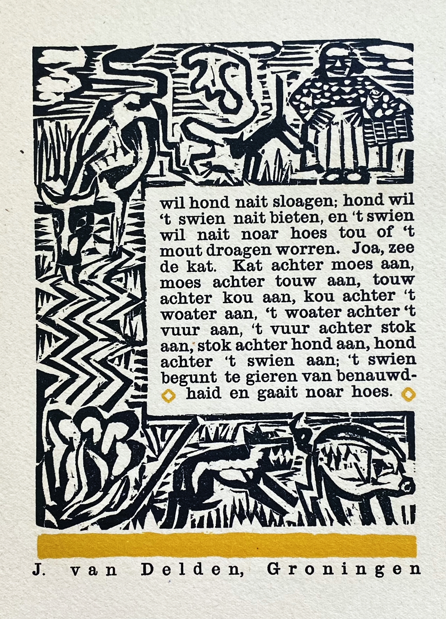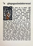 Vormgeving en druk van Hendrik Nicolaas Werkman. Een verrukkelijk lees- en kijkboek met zijn ruige linnen en dito papier, de boerse houtsneden (deels gekleurd) en de gave elementaire sprookjes, met haast hoorbaar knauwaccent verteld door de achttiende-eeuwse huisnaaister Trijntje Wijbrands aan de kinderen van de Groningse familie Arends. Die tekenden de ‘wondervolle verhalen’ op ‘in kinderlijke woordenkeus en in kinderlijke spelling’, aldus Herman Poort in zijn inleiding. ‘Later heb ik het heerlijk-vuile boekje eens van haar mogen leenen en ik heb het (…) prachtig gevonden’. En Werkman en Dijkstra raakten onder dezelfde bekoring… en wij op onze beurt, natuurlijk!