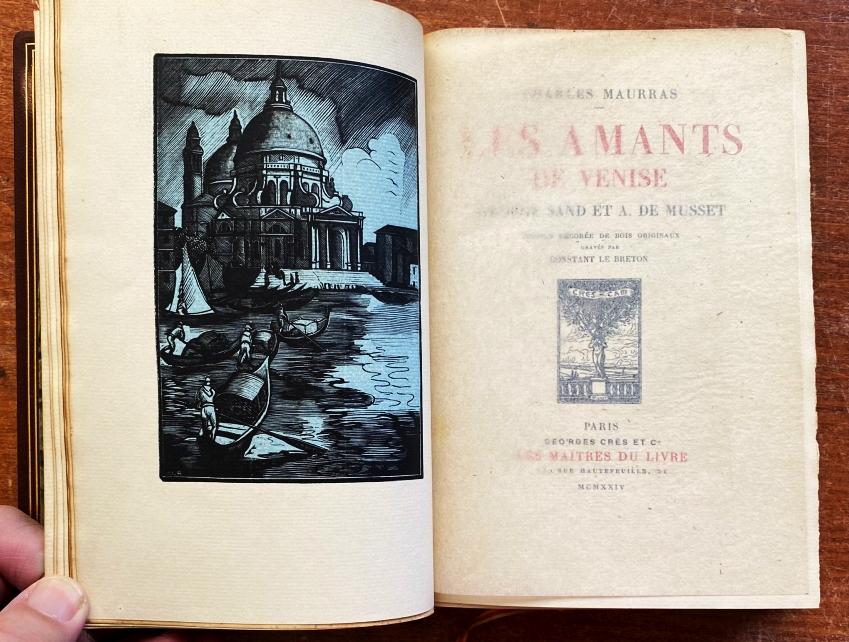 49. (VENETIË). MAURRAS, Charles Les amants de Venise. George Sand et A. de Musset. Édition décorée de bois originaux gravés par Constant le Breton. Parijs, Georges Crès, 1924. Heelmarokijn met vergulde kaders, de rug rijk verguld, met vijf ribben (Flammarion-binderij). Gemarmerde schutbladen en meerkleurig leeslint. Kop verguld. (4), 388 p. Gedrukt in 1972 genummerde exemplaren van 1972. Frontispice-houtsnede in sfeervolle kleur. Met grotere en kleinere vignetten. Herdruk (eerste uitgave: 1902). Enkele onbeduidende gebruikssporen op de rug.