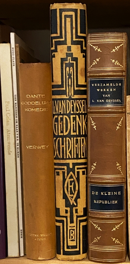 Van links naar rechts Celan, Claus, Dante, Van Deyssel 15 en 1312. DANTE ALIGHIERI De Goddelijke Komedie. Vertaling in terzinen door Albert Verwey. Haarlem, Tjeenk Willink, 1923. Verguld naturel kalfsleer. Inslag (binnenkanten) met guirlandes in goud, schutbladen mooi donkerblauw en rood gemarmerd. XVI, 198; (2), 196; 202 p. 1e druk. Rug verbruind, wat roestvlekjes aan de randen. Voorin plakte Wim Zaal een portret van Dante – een Roemeense postzegel uit 1965!