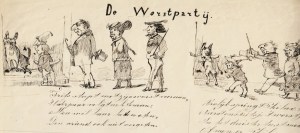 22. JONGMANS, L. De worstpartij. (Getekend beeldverhaal, ca. 1870). Originele tekening, of liever 8 originele tekeningen in stripvorm, op één groot papier getekend. Op de achterzijde staat met potlood ‘871’ of ‘Q71’. 43,5 x 33,5 cm. Met zwarte en bruine inkt en opzetlijnen in potlood. Onder elke tekening staat een vierregelig dichtcouplet, handgeschreven. De achtste tekening is linksonder gesigneerd ‘L. Jongmans’. Horizontaal gevouwen. Enkele randscheurtjes.