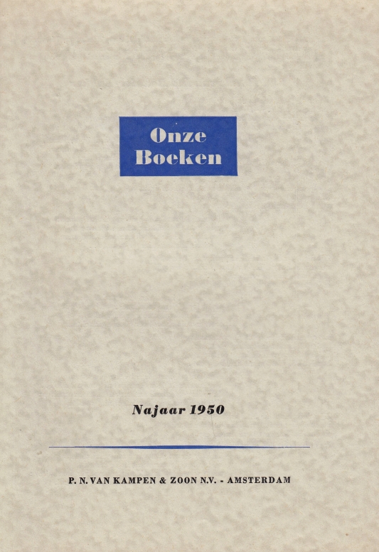 19. (KAMPEN, P.N. van) Onze Boeken. Najaar 1950. Amsterdam, P.N. van Kampen & Zoon N.V., 1950. 19 x 13 cm. Geniet. 12 p. Geïllustreerd. In blauw en zwart gedrukt.
