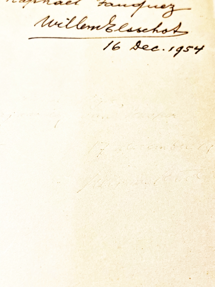 * Exemplaar met handgeschreven, gesigneerde opdracht van de auteur op het voorste schutblad: ‘Aan Raphael Fauquez/ Willem Elsschot/ 16 Dec. 1954’. Onder deze opdracht schreef Kees van Kooten in potlood de (inmiddels uitgegumde) opdracht (met hard potlood geschreven, daarom nog uitstekend leesbaar): ‘Voor mijn vriend Rijk,/ op de verjaardag van Kasper/ en Toon,/17 december 1997/ Kees van Kooten’. Inderdaad: 17 december is niet alleen de geboortedag van Kasper van Kooten en van Toon Hermans, maar ook van Rijk de Gooijer, waarmee de begiftigde in de opdracht ook meteen geïdentificeerd is. Schuhmacher D/E5.