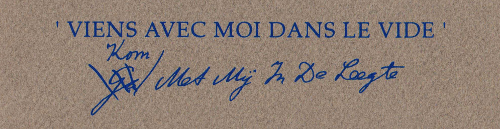 * Eén van de 50 auteursexemplaren. Vertaling van ‘Viens avec moi dans le vide’ van Yves Klein, maar dan uit het Duits, om het ingewikkeld te houden. ZRV 68.