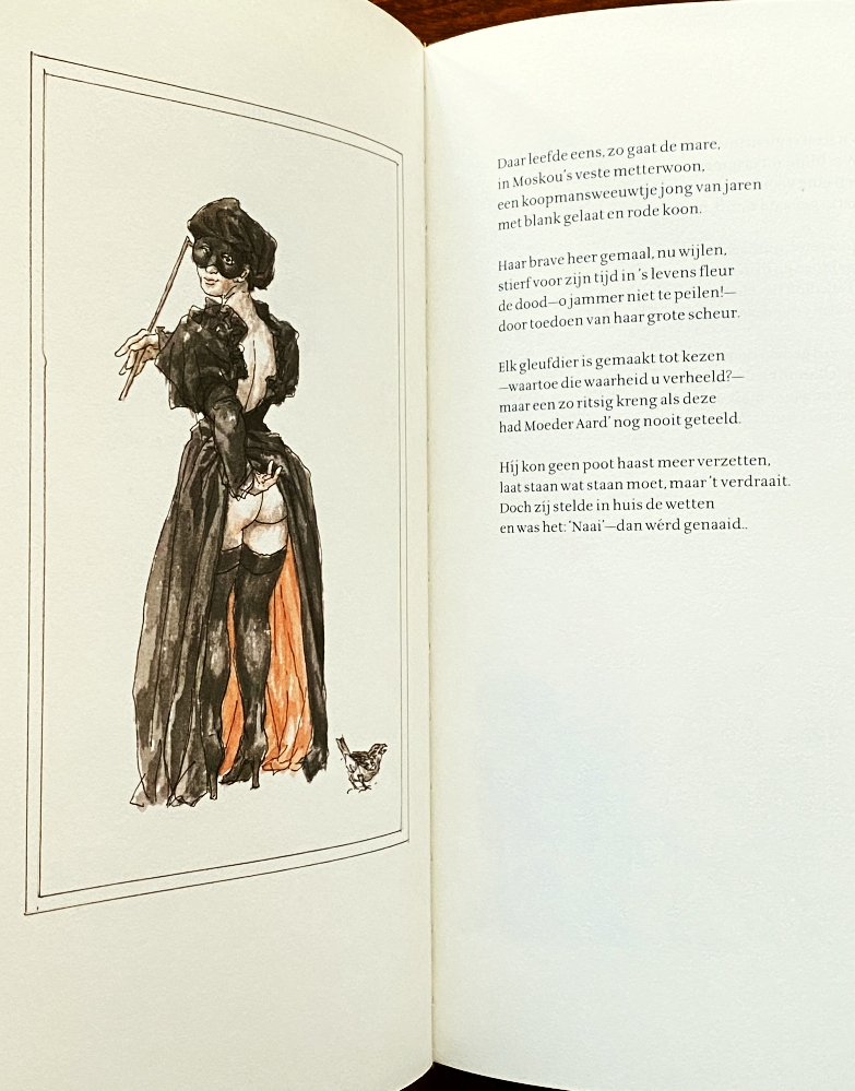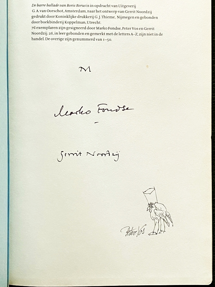4. BARKOV, Ivan, (en Gerrit NOORDZIJ, Peter VOS en Marko FONDSE) De barre ballade van Boris Borus. (Vertaald door Marko Fondse, vormgegeven door Gerrit Noordzij en geïllustreerd door Peter Vos). Amsterdam, Van Oorschot, (1991). Linnen met stofomslag. Gedrukt in een oplage van slechts 76 genummerde en door vertaler, typograaf en kunstenaar gesigneerde exemplaren. 1e druk.