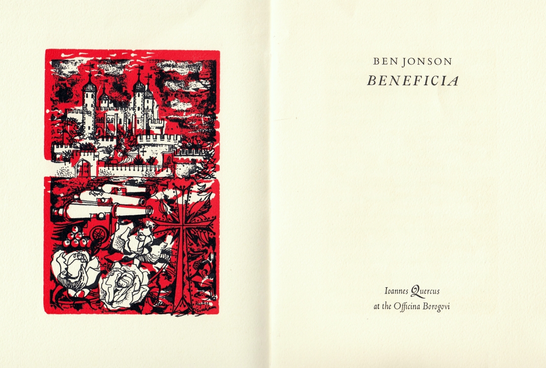 22. (GRAHAM, Rigby). JONSON, Ben Beneficia. Banholt, Bonnefant Press (‘Ioannus Quercus at the Officina Borogovi’), 1998. Cahiersteek. 8 p. Met een illustratie van de Tower of London door Rigby Graham in rood en zwart. Gedrukt in 53 copies. Iets gekreukt.
