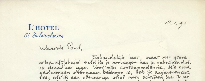 * Paul Sars, hoogleraar in Nijmegen, kwam eind jaren tachtig via Cees van der Pluijm (alias Paul Lemmens) in contact met P. Hij was onder meer betrokken bij de uitgave van Lyriana, poëzie van Drs. P in het Frans, Duits en Engels (Nijmegen, De Stiel, 1993). Het betreft hartelijke correspondentie, soms zijn het dankkaarten voor iets dat Sars hem had gezonden, steeds bloemrijk en uitgebreid verwoord. In een uitgebreide brief van 18 januari 1991, geschreven op briefpapier van het kleine Parijse hotel L’Hotel (waar Oscar Wilde eenennegentig jaar eerder was overleden) gaat P dieper in op poëzietheorie.