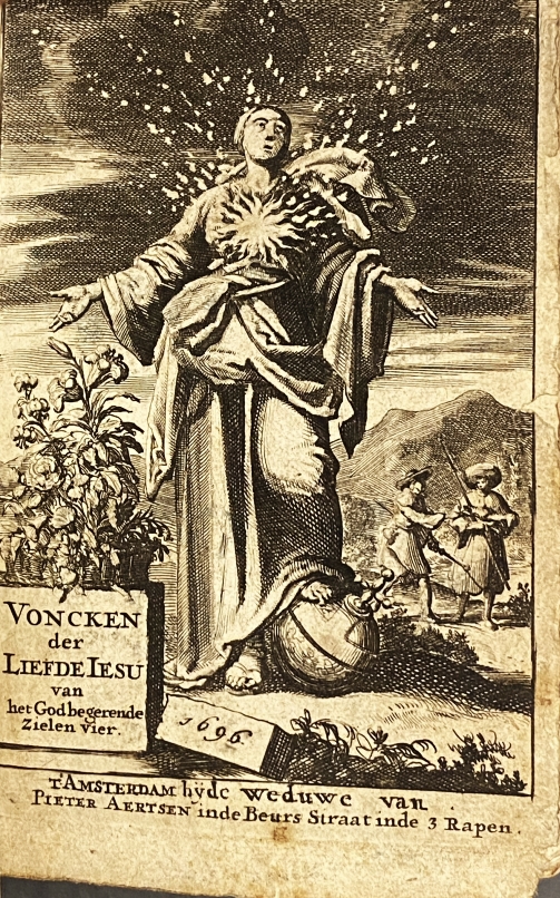 31. LUYKEN, Jan Voncken der Liefde Jesu, van het Godt-begerende Zielen-vuur. Bloemetjes der Saalige Hoope, tot verheugelykheid der Wandelaars, langs den Weg, na vreeden-Ryk. Amsterdam, Weduwe Pieter Arentsz (in de Beursstraat, in de drie Raapen), 1696. 16 x 11 cm. Halfleer met gemarmerde platten. (16), 212, (20) p. Met 50 etsen van Jan Luyken. Herdruk van de uitgave van Pieter Arentsz (1687). 19e-eeuwse band? met dito schutbladen. Rood nummertje op de titelpagina. Boekblok heeft wat randslijtage. Wat vlekkig, kleine ezelsoortjes.