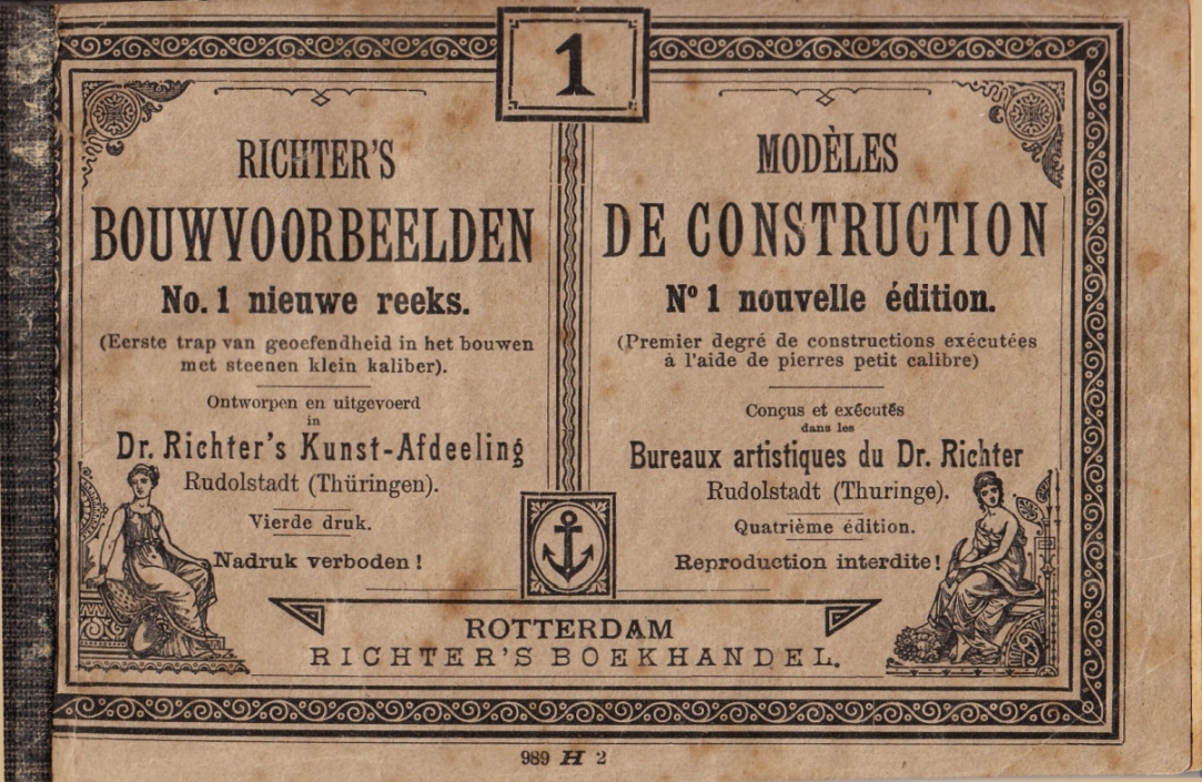 2. ANKER-BOUWSTENEN Richter’s Bouwvoorbeelden. No. 1 nieuwe reeks. (Eerste trap van geoefendheid in het bouwen met steenen klein kaliber). Rotterdam, Richter’s Boekhandel, ca. 1900. Oblong 9 x 14 cm. Gebonden in halflinnen. (2), (16), (4) p. 16 platen gedrukt in geel, blauw, rood en zwart. Met toelichtende tekst. 4e druk. Iets kort afgesneden. Enkele kleine scheurtjes en vlekjes. Reparaties met papierplakband.