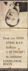 8. BOON, Louis Paul Denk aan HEM. STEM B.S.P. (Luciferboekje) Bedrukt luciferboekje, ledig. 5 x 4 cm. Jaren zestig? Met foto van Boon en tekst aan één kant. Gefabriceerd bij de Union Allumettière S.A. te Brussel. Gebruikssporen: de lucifers zijn op en de afstrijkstrook gekrast, zoals het hoort.