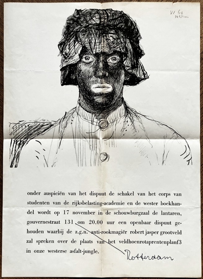 * Schitterende Rotterdamse affiche, een originele en vrije voorstelling die nu een bijsluiter nodig zou hebben, maar anno 1964 hoogst tegendraads was. Uit een bekende tekensessie van juni 1964 waarin Grootveld ook full-size te zien was: in blackface én met damesondergoed. Hier is de prent gebruikt om reclame te maken voor een openbare discussie van een dispuut van de Rijksbelastingacademie ‘over de plaats van het veldhoenrotaprentenplanf3 [sic!] in onze westerse asfalt-jungle’. Bij het adres, ‘schouwburgzaal de lantaren, gouvernestraat 131’ heeft iemand in grote balpenletters ‘Rotterdam’ geschreven. Mooie gebruiksprent uit het volle vrije leven van 59 jaar geleden.