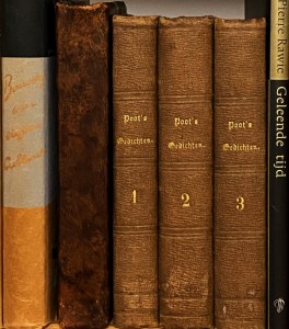 32. POOT, Hubert Korneliszoon H.K. Poot’s Gedichten. Amsterdam, S.J. Baalde, 1780. Compleet in drie deeltjes. 15 x 10 cm. 19e-eeuws linnen. (2), LXXX, 286; (4), 440; (4), 384 p. Met drie identieke, gegraveerde titelpagina’s naar ontwerp van J. Buys, gesneden door J. Koning, waarop het portret van Poot prijkt op een versierde gedenkzuil. Uitvoerige inleiding van de dichter. Voorin onbeschreven plakzegeltjes. Wat gebruikssporen, o.a. margepotloodstrepen bij de inleiding.