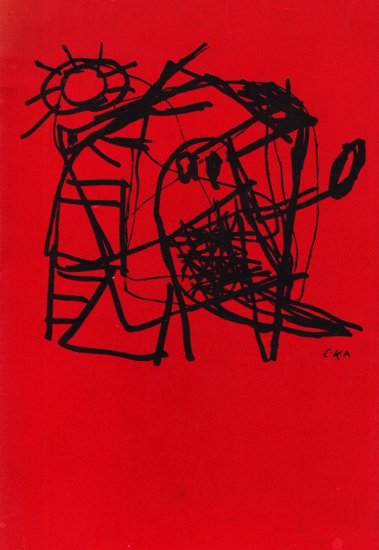 39. SCHIERBEEK, Bert, en Karel APPEL Het bloed stroomt door. (Met tien (plus twee in de bijlage en één op het omslag) paginagrote tekeningen van Karel Appel). Amsterdam, De Bezige Bij, 1954. Cahiersteek. (16) p. Met losse bijlage waarop de Franse vertaling van Schierbeeks tekst (vertaald door Henri Deluy). 1e druk. Twee kleine vlekjes op voorplat, maar een goed exemplaar.
