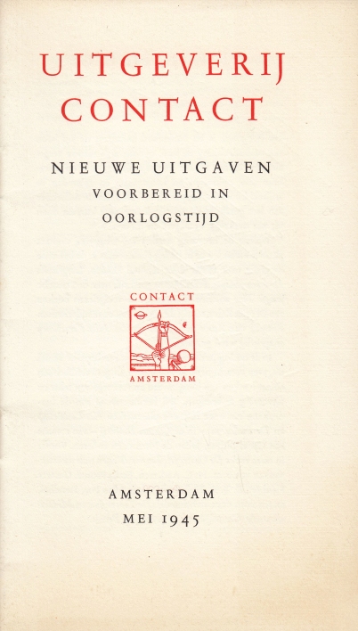 10. CONTACT Uitgeverij Contact. Nieuwe uitgaven voorbereid in oorlogstijd. Amsterdam, Uitgeverij Contact, 1945. Geniet. 24 p. incl. omslag. Gedrukt in rood en zwart. Geïllustreerd. 1e druk.