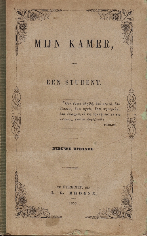 29. [LOOSJES, Adriaan] Mijn kamer. Door een student. Utrecht, J.G. Broese, 1853. Halflinnen met op voor- en achterkant het originele papieren omslag aangebracht. (4), 200 p. 2e druk. Het vooromslag vertoont lichte gebruikssporen.