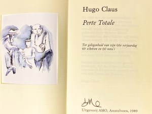 9. CLAUS, Hugo Perte Totale. Ter gelegenheid van zijn 60e verjaardag, 60 schetsen en 60 nota’s. (Met een originele tekening van Hugo Claus als frontispice). Amstelveen, AMO, 1989. Verguld linnen (Binderij Phoenix). 70 p. Gedrukt in een oplage van 360 genummerde exemplaren. 1e druk.