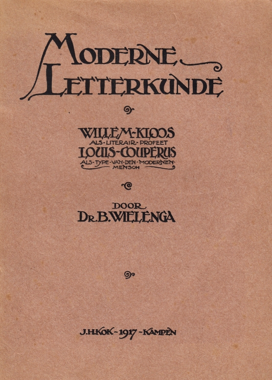 15. (COUPERUS, Louis). WIELENGA, Dr. B. Moderne letterkunde. Willem Kloos als literair profeet. Louis Couperus als type van den modernen mensch. Kampen, Kok, 1917. Ingenaaid. 112 p. 1e druk. Wat kreukjes in het omslag, door het boek heen wat roest.