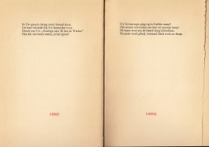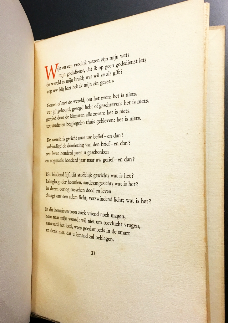 * Astrant afzijdig gepresenteerd boek met zijn 107 vierregelige gedichten, slechts één per (hoge smalle) pagina, de paginanummers in rood gedrukt als Romeinse cijfers, nummer 99 = ‘LXXXXVIIIJ‘! Een van de 65 Arabisch genummerde exemplaren op Wit Hollandsch papier van Pannekoek (dat overigens een getinte indruk maakt). Rijkse 2.88. Van Dijk 65.
