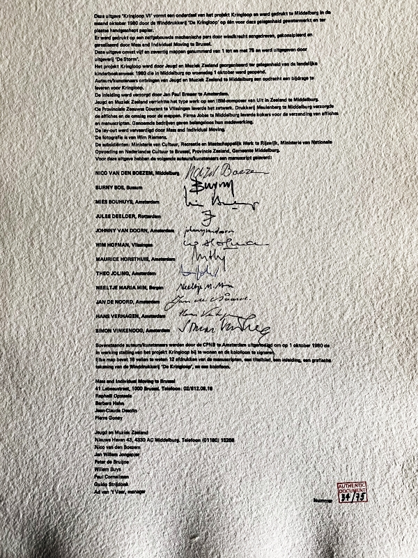 * Bevat bijdragen van Nico van de Boezem, Burny Bos, Mies Bouhuys, Jules Deelder, Johnny van Doorn, Wim Hofman, Maurice Horsthuis, Theo Joling, Neeltje Maria Min, Jan de Noord, Hans Verhagen en Simon Vinkenoog, alles gedrukt in facsimile van het handschrift/ tekening/ notenschrift opspeciaal voor de gelegenheid vervaardigd, opvallend viltig zacht papier met watermerk ‘Zeeland 1980’. Verder bevat de map een grafische tekening van Winddrukkerij ‘De Kringloop’, een titelblad en een colofon dat door alle auteurs gesigneerd is. Het blad met de inleiding van Jan Paul Bresser ontbreekt.