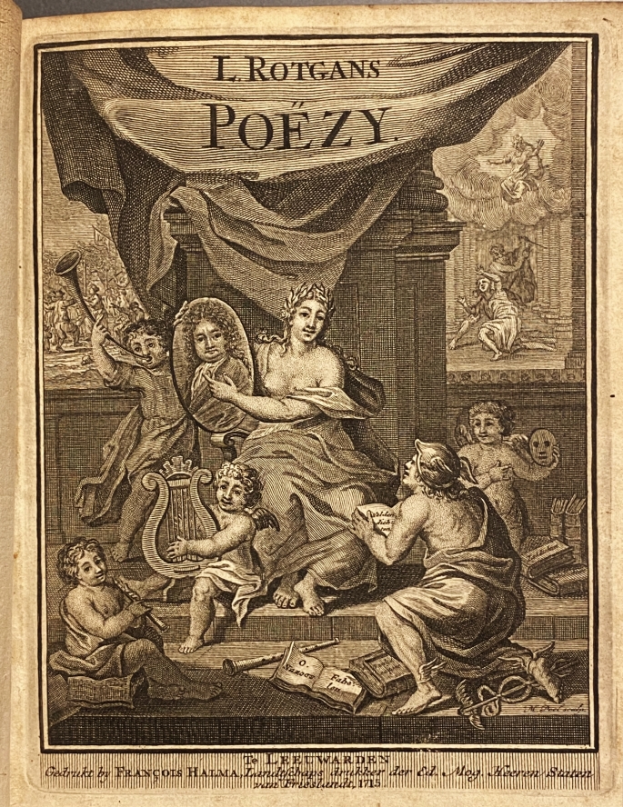 25. ROTGANS, Lukas Poëzy, van verscheide mengelstoffen. Leeuwarden, Francois Halma, 1715. Jaartal overgeplakt met een uitgeversaanduiding van Johannis Oosterwijk, Amsterdam, 1715. 22 x 16 cm. Contemporain perkament met vijfribbige rug, waarop oudtijds netjes de titel geschreven is, met blindstempelversiering. 14, (62), 680 p. Frontispice, titelvignet, wapenvignet, 45 tekstvignetten van Folkema (naar Houbraken) en de 2 `Boerekermis’-prenten. 1e druk. Rubberstempeltje van advocaat en notaris A.H. van Kleffens uit Harlingen (1856-1926). Zeer net exemplaar.