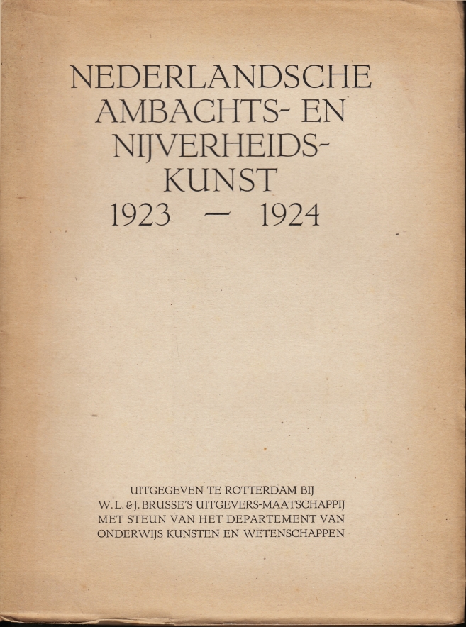 29. (VECHT, N.J. van de). V.A.N.K. Nederlandsche Ambachts- en Nijverheidskunst. 1923-1924. Rotterdam, W.L. & J. Brusse, 1925. 25 x 19 cm. Ingenaaid met typografisch omslag. 80, 80 p. Achterin 103 zwartwitfoto’s van kunstwerken. Gezet uit de Erasmus Mediaeval van S.H. de Roos. 1e druk. Band deels iets verbruind, maar een mooi exemplaar.