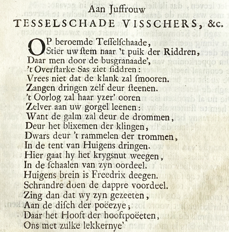 30. VOS, Jan Alle de gedichten. Tweede deel. Amsterdam, Hendrik & Gerrit Bosch, 1726. Perkament. (8), 572, (4) p. Gegraveerd uitgeversvignet: een putto reikt naar muziekinstrumenten die op een rijtje aan een boom hangen, voor een rivierlandschap. Op verschillende plaatsen in het boek en op het achterplat vlekkig.
