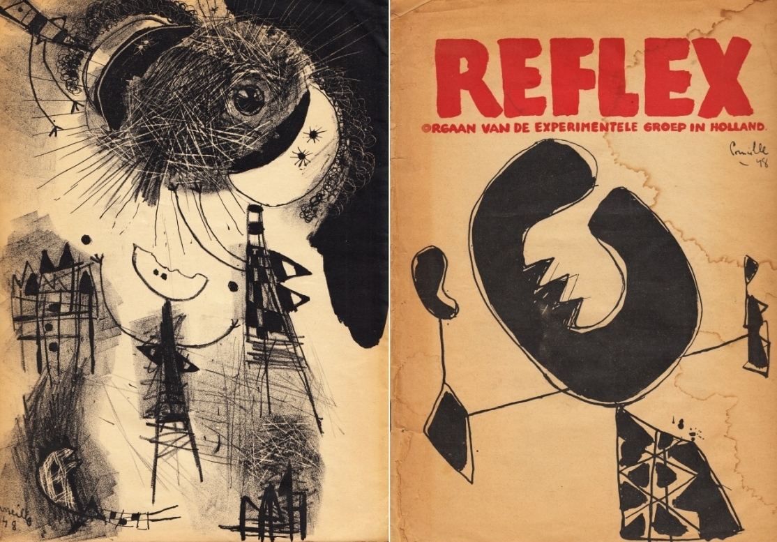 26. REFLEX Orgaan van de experimentele groep Holland. Aflevering 1. Amsterdam, (eigen beheer), 1948-1949. Geniet. Matig exemplaar: voorzijde omslag (p. 1-2) los en met vochtvlekken, achterzijde omslag (p. 15-16) ontbreekt. de originele litho’s van Constant en Corneille zijn wat verbruind.