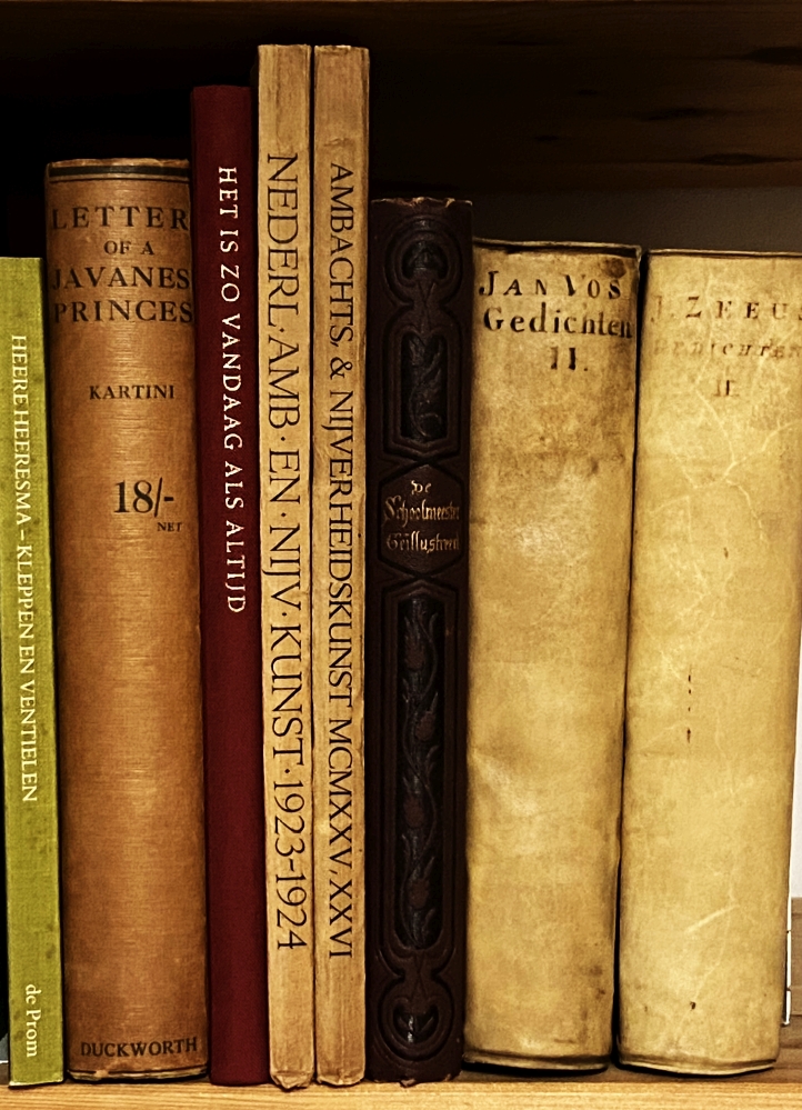 * Raden Adjeng Kartini (1879-1904) werd na haar dood beroemd door de brieven die zij schreef aan Nederlandse vriendinnen: Door duisternis tot licht. Gedachten over en voor het Javaansche volk luidt de Nederlandse titel (1911). De inleiding van Couperus is alleen voor de Engelse vertaling vervaardigd en niet in het Nederlands verschenen! Wel publiceerde hij een heel vrije bewerking als feuilleton, onder de titel ‘Intieme impressies VIII’, opgenomen in Proza III. Dit is een indrukwekkend boek, ook uiterlijk door zijn stevige, vierkante vorm, fraaie groenlinnen band met gele titelopdruk, en simpel stofomslag: uitgeversblurb in een kader onder titel/auteur/inleider. Zeldzaam, zeker met stofomslag.
