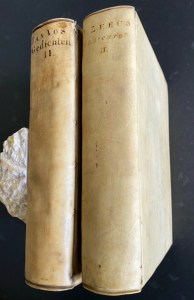 32. ZEEUS, Jakob Overgebleve gedichten. Amsterdam, Antoni Schoonenburg, 1737. Klein 4to. Perkament. (2), xliv, (36), 288, LIV p. Titelvignet en twee andere vignetten, twee tussentitels (bij de Wolf en bij Horatius) plus twee schitterende portretten door Houbraken (die Zeeus’ leermeester was geweest als graveur). 2e druk (eerste: 1726). Vlek achterop, driehoek geknipt uit eerste schutblad, verder mooi.