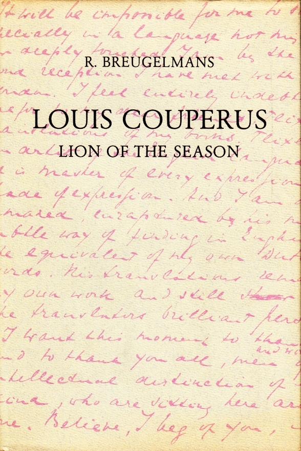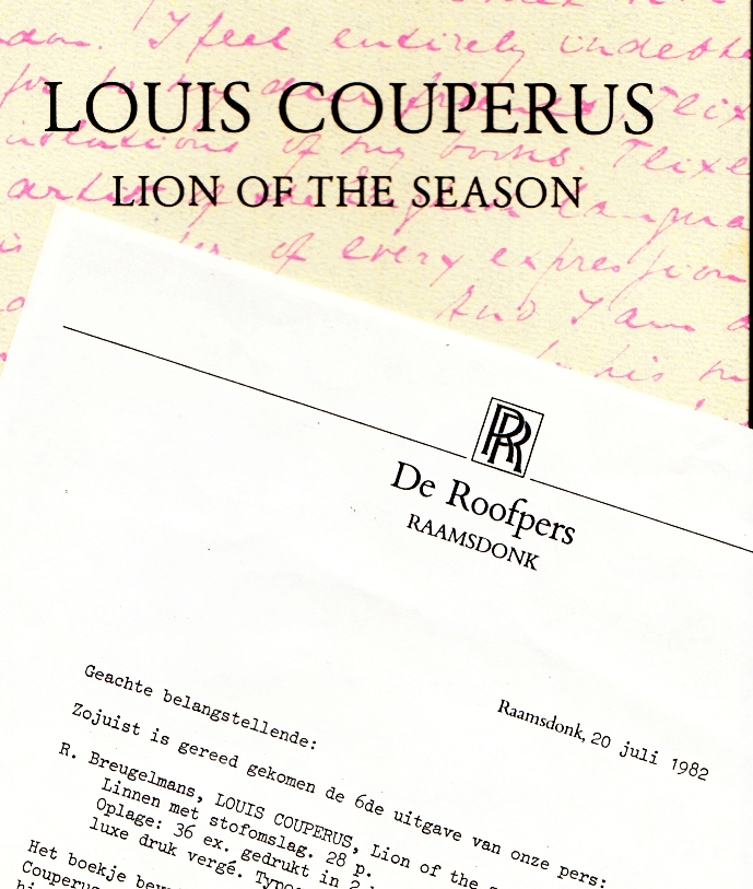 20. BREUGELMANS, R. Louis Couperus. Lion of the season. Raamsdonk, De Roofpers, 1982. Linnen met stofomslag. 28 p. Gezet uit de Garamond en gedrukt op 140 grams Hollands luxe druk vergé in een oplage van 36 genummerde exemplaren. Met facsimiles naar het handschrift van Couperus, gedrukt in paars. 1e druk.