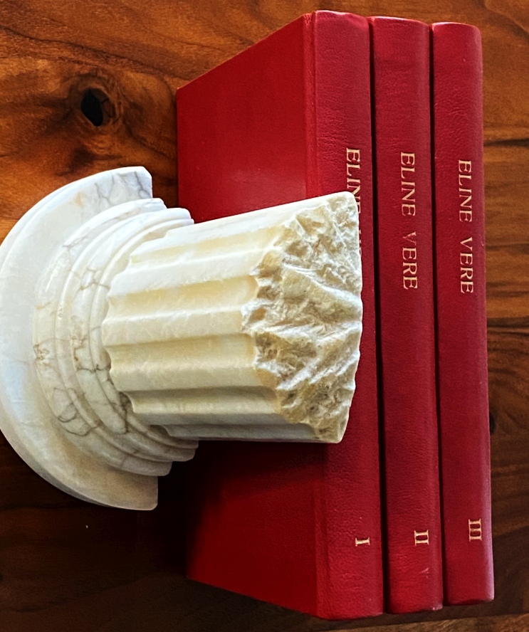 22. COUPERUS, Louis Eline Vere. Een Haagsche roman. Amsterdam, Van Kampen, 1889. Drie delen. Verguld heelleder met schutbladen van gemarmerd papier (degelijke, maar saaie banden uit de jaren tachtig van de twintigste eeuw). 250; 264; 262, (2) p. Aan het eind twee advertentiepagina’s voor andere boeken van uitgever Van Kampen. 1e druk. Naam in potlood op Franse titels (‘A. de Koe’), kneep op enkele plaatsen verstevigd met zuurvrij tape of Japans papier.