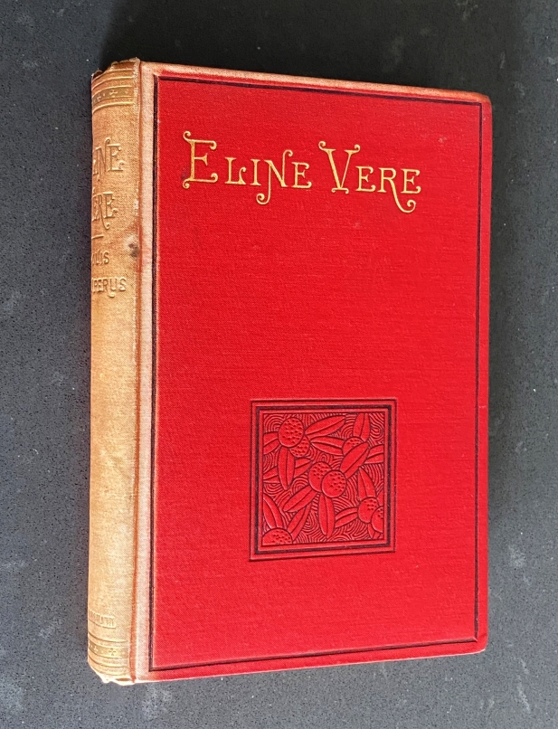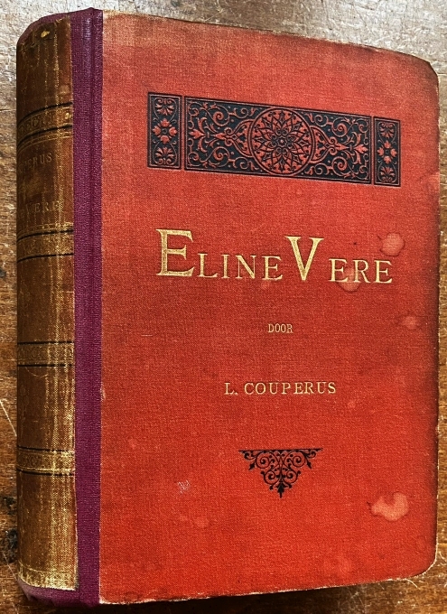25. COUPERUS, Louis Eline Vere. Translated from the Dutch by J.T. Grein. Londen, Chapman & Hall, 1892. Rood uitgeverslinnen met goud-, zwart- en blinddruk. (4), 312 p. 1e druk. Rug verbleekt, achterop een bleek vlekje. Eerste blad grotendeels uitgescheurd en beplakt met een exlibris.