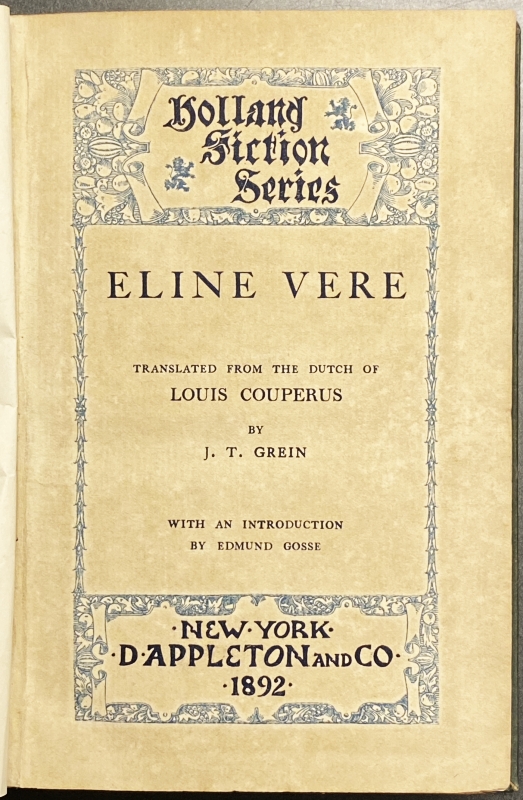 26. COUPERUS, Louis Eline Vere. Translated from the Dutch by J.T. Grein. With an Introduction by Edmund Gosse. New York, D. Appleton and Company, 1892. Later groen karton, wellicht een privéband uit de jaren 20 of 30. (2), X, 312, (14) p. Titelpagina gedrukt in donkerblauw, lichtblauw en zwart. 1e druk. Op de rug verbleekt, voorop schaafplekjes. Exlibris. Buitenste bladen van het boekblok verbruind.