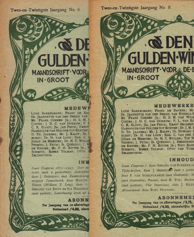 31. (COUPERUS, Louis) Louis Couperus in het literaire maandblad Den Gulden Winckel, jaargang 22, nr. 6-9, 1923. Baarn, Hollandia Drukkerij, 1923. 27 x 20 cm. Vier losse nummers. Geniet, met de omslagen. Genummerde pagina’s 81-145 plus ongenummerde advertentiebladzijden. Geïllustreerd. 1e druk. Zeer goede staat.