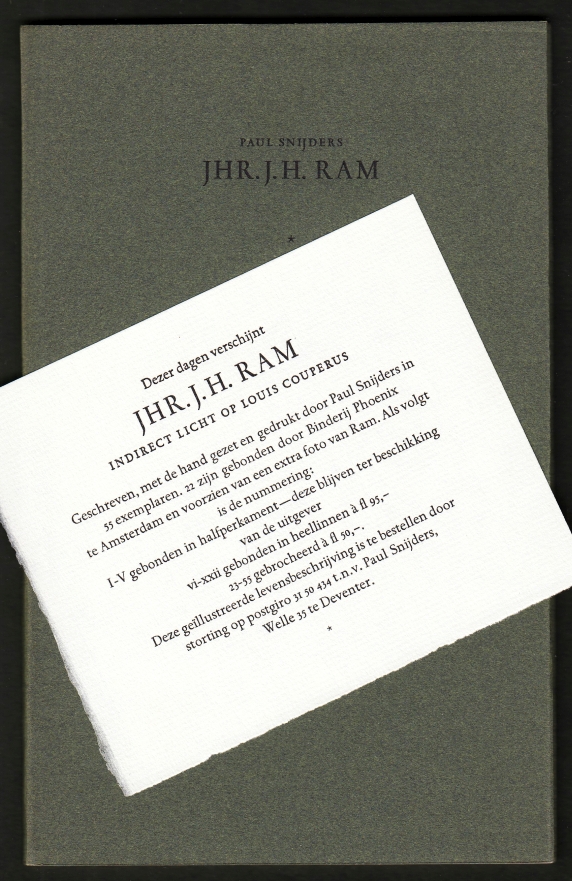 21. SNIJDERS, Paul Jhr. J.H. Ram. Indirect licht op Louis Couperus. Deventer, PS (= Paul Snijders), 1983. Ingenaaid. (2), 22 p. Geïllustreerd. Met de hand gezet en gedrukt in een oplage van 55 exemplaren. 1e druk.