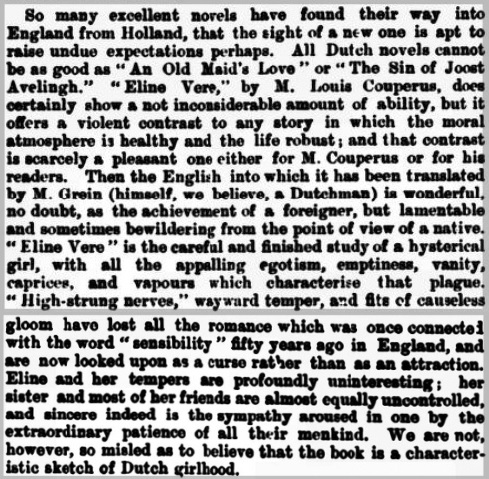 * ‘En dan vraag ik mijzelf af of er éen meisje van 23 jaren in onzen tijd in ‘s-Gravenhage geleefd heeft, of zal leven, dat ook maar in de verste verte gelijkt op Eline Vere, die in de titelrol optreedt. Het is mogelijk dat in Parijs of Londen zich honderde dergelijke jonge vrouwen bevinden; maar hier in Den Haag mag men alle huizen onderzoeken van kelder tot zolder – er zal er geen zoodanig exemplaar in onze woningen gevonden worden. Naast alle hulde, die ik den schrijver breng voor zijn behandeling dezer epineuze dame, geloof ik toch dat dergelijke giftplant nog niet groeit op onze bodem (…).’