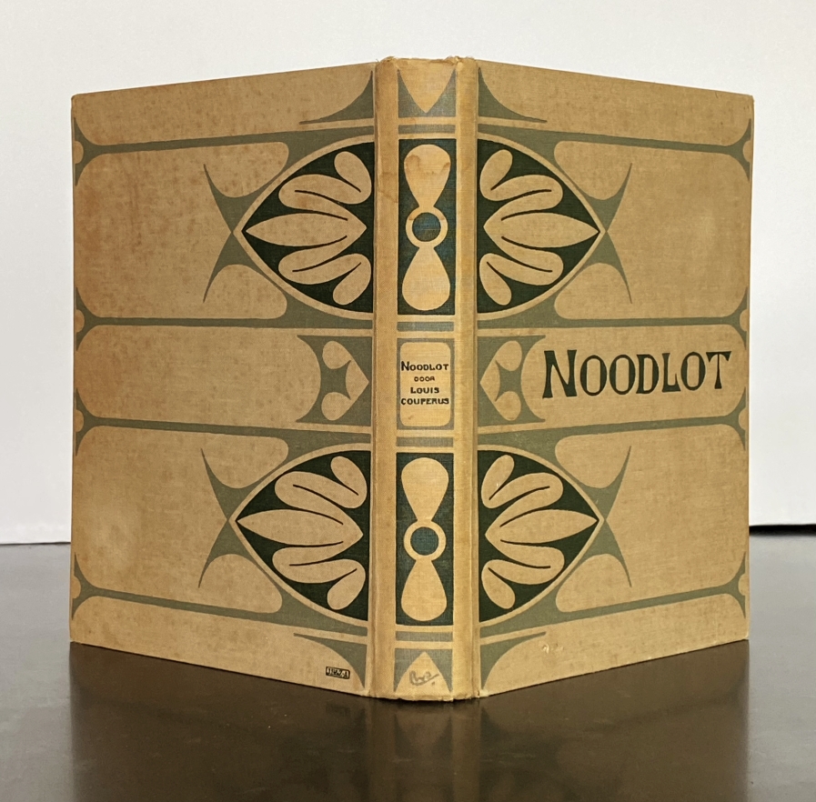 27. COUPERUS, Louis Noodlot. Amsterdam, L.J. Veen, [1917]. Beige linnen met decoratie over voor- en achterplat (ontwerp R.W.P. de Vries jr.). 192 p. 4e druk. Rug aan de randen wat gesleten. Wat roest, vooral de twee buitenste pagina’s van het boekblok. Kleine gaatjes in voorplat.