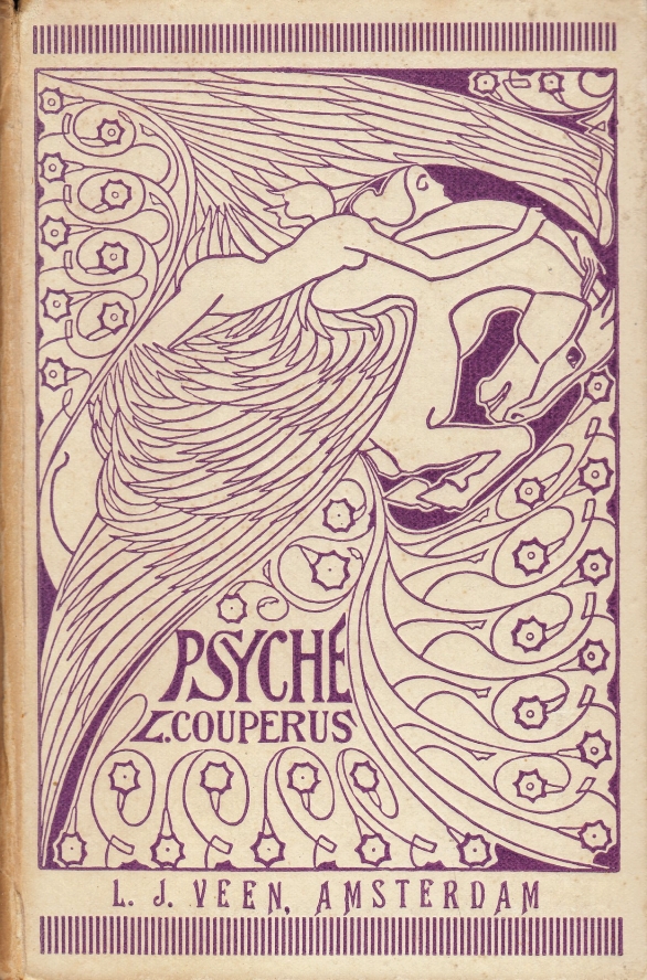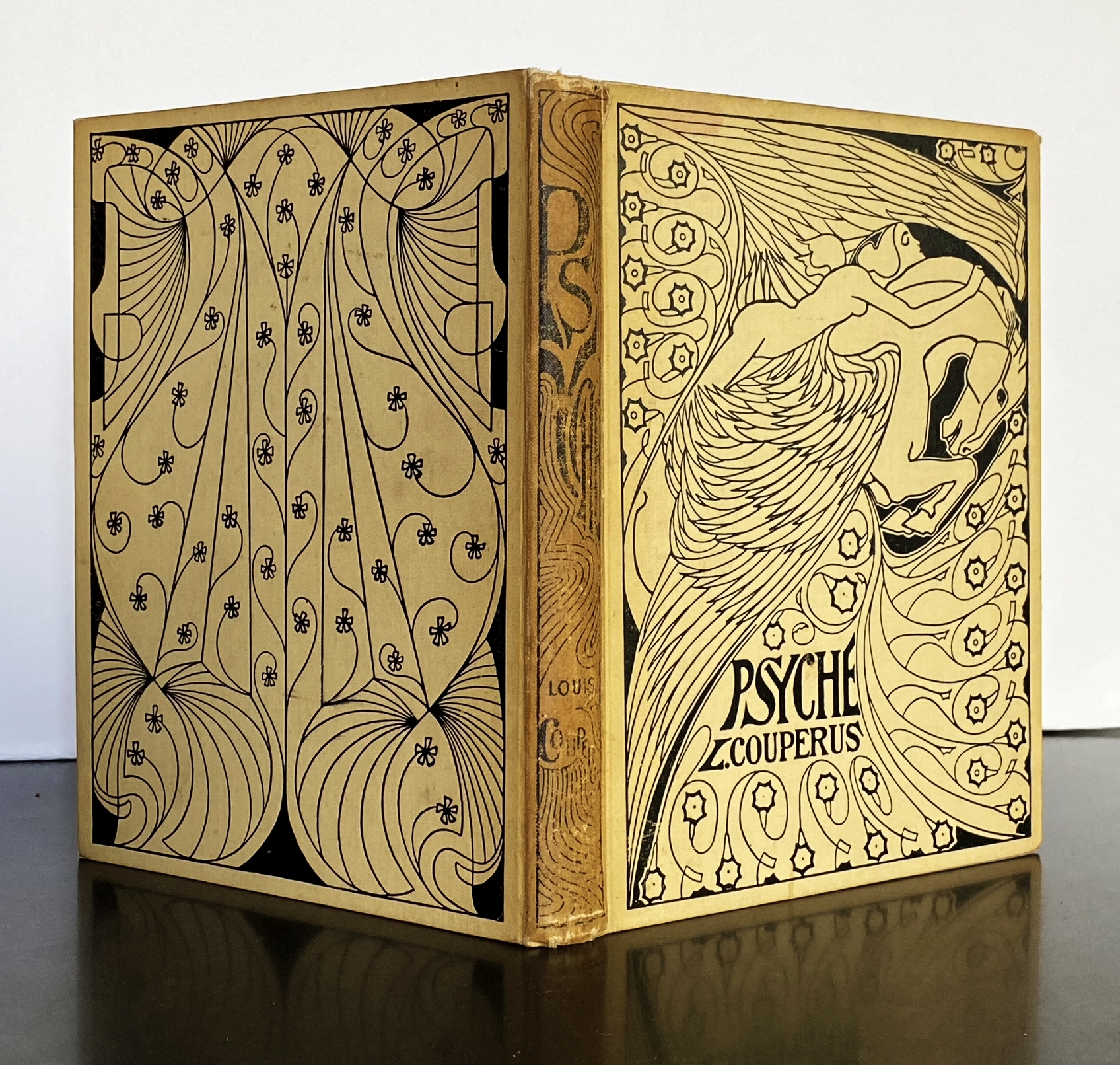 36. COUPERUS, Louis Psyche. Amsterdam, Veen, [1917]. Karton (met het bandontwerp van Jan Toorop). 192 p. 5e druk. Rug verbruind, deel van het stofomslag (illustratie van Toorop) op binnenzijde voorplat geplakt (vgl. VV 193,24), exlibrisje (ontw. J.Franken Pzn.), datum en plaats op schutblad, restje verwijderd exlibris, eveneens op schutblad. Voor zo’n goedkoop gemaakt boek in prima staat.