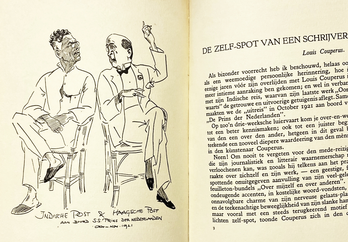 * Verslag van een door de journalist Jan Feith opgetekende en door Willy Sluiter uitgebeelde ontmoeting met Couperus op de boot naar Indië (oktober 1921) in deze omvangrijke verzameling geschreven portretten met fraaie tekeningen van Willy Sluiter. Ook Albert Vogel, Willem Mengelberg, Kees van Dongen, Jozef Israëls, Abraham Kuyper, Is. Querido, Sarah Bernardt, generaal Snijders, Lodewijk van Deyssel, Anthony Fokker en Willy Sluiter zelf worden heel aardig in dit journalistieke boek geportretteerd.