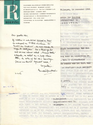 55. (COUPERUS, Louis). Karel REIJNDERS De gewone lezer, de geleerde lezer en de lezer puur. Doorslag in typoscript. 4 bladen. Met eveneens in doorslag van typoscript, begeleidende brief van Reijnders aan de redactie van Roeping, gedateerd ‘Nijmegen, 16 december 1960’. En met een handgeschreven briefje van Lambert Tegenbosch, redacteur van Roeping.