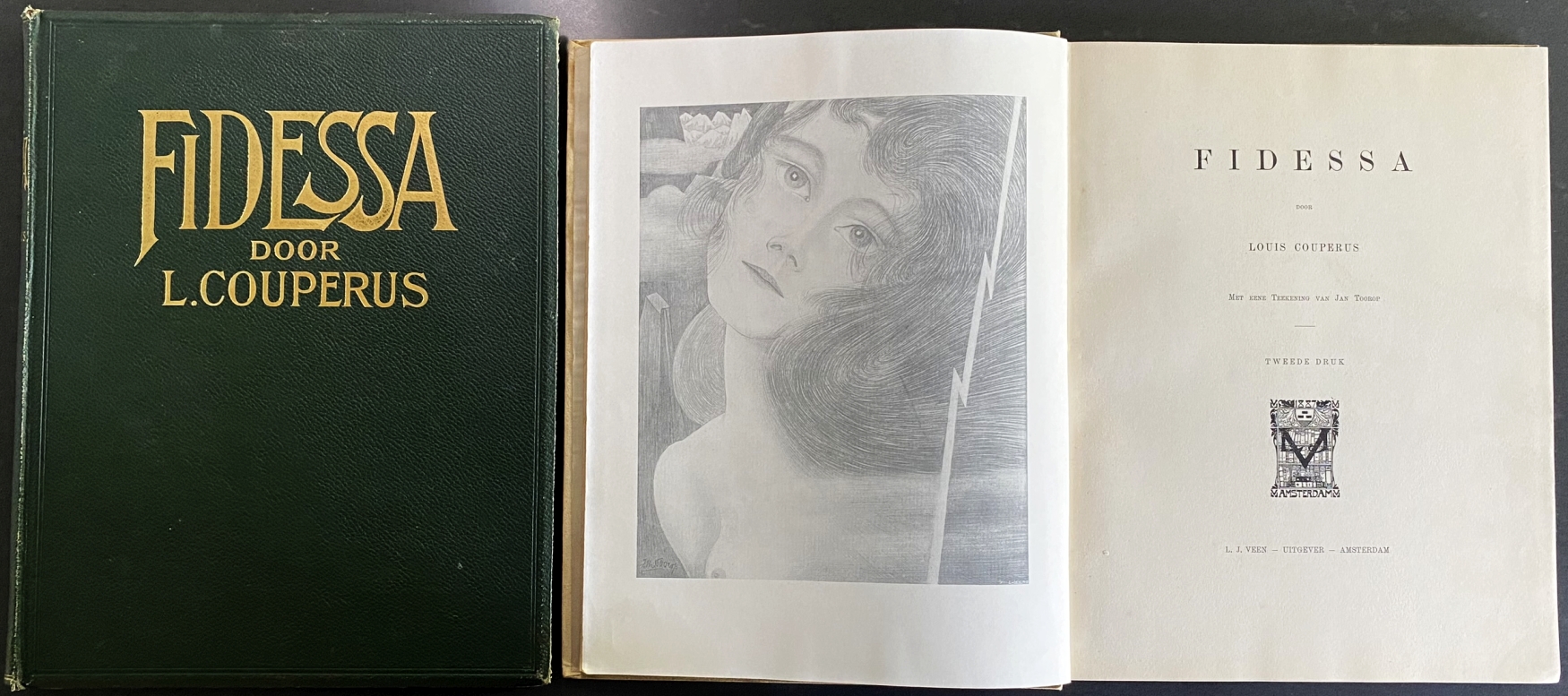 12. COUPERUS, Louis Fidessa. Met eene Teekening van Jan Toorop. Amsterdam, Veen, [1900]. 28 x 22 cm. 4to. Linnen. (8), 104 p. 2e druk. Lichte band iets vuil geworden, rug verkleurd, voorplat aan rechterzijde wat verweerd.