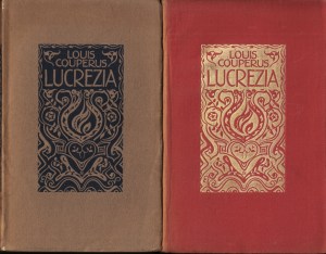 25. COUPERUS, Louis Lucrezia. Amsterdam, Querido, 1920. Rijk verguld linnen. 120 p. Kop verguld (er bestaan ook exemplaren met niet-vergulde kop!). Groen leeslint. Titel in twee kleuren. Achterin vermelding van de eerste zeven deeltjes van de Litteraire Luxe-reeks. 1e druk. Rug verschoten. Naam in potlood en rest plakzegeltje voorin.