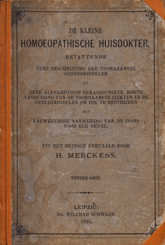 28. (HOMEOPATHIE). SCHWABE, Willmar De kleine homoeopathische huisdokter, bevattende eene beschrijving der voornaamste geneesmiddelen en eene alphabetisch gerangschikte, korte aanduiding van de voornaamste ziekten en de geneesmiddelen om die te bestrijden met nauwkeurige aanwijzing van de dosis voor elk geval. Uit het Duitsch vertaald door H. Merckens. Leipzig, Dr. Willmar Schwabe, 1893. Halflinnen met opgeplakt origineel omslag (rug, voor- en achterkant). 134 p. 2e druk. Gevolgd door: GeïIllustreerde Prijs-Courant der Centrale Homoeopathische Apotheek van Dr. Willmar Schwabe te Leipzig. De grootste homoeopathische inrichting van de wereld. Leipzig, Dr. Willmar Schwabe, 1893. 124 p. Met 8 chromolitho’s en 80 houtgravures, waarvan één op de achterkant – deze is achterop het boek geplakt. Met uitvoerige bibliografie. Wat slijtage van de boekband.