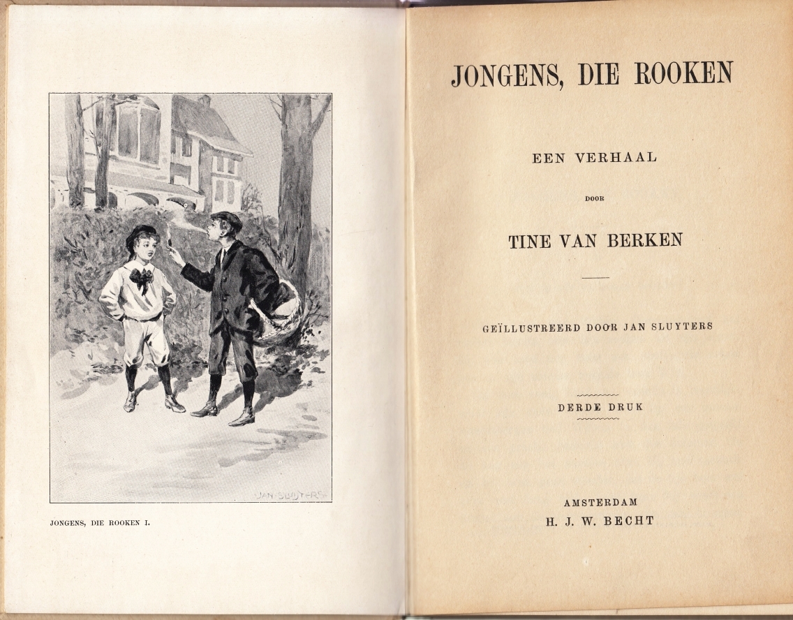 38. SLUIJTERS, Jan – Tine van BERKEN Jongens, die rooken. Een verhaal. Geïllustreerd door Jan Sluyters. Amsterdam, H.J.W. Becht, [1914]. Karton met goudopdruk. 66 p. Met twee zwartwitplaten, reproductie van gewassen inkttekeningen van Sluijters. 3e druk. Netjes. Naam in potlood.