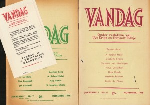 * In 1946 nam de nog maar net aan de Noordafrikaanse oorlog en Italiaanse krijgsgevangenschap ontsnapte jonge schrijver Uys Krige samen met Ehrhardt Planje de redactie over van een Zuid-Afrikaans cultureel tijdschrift, Vandag, en maakte het tot een meertalig (Nederlands, Suidafrikaans en Engels) literair tijdschrift. Daarin verschenen gedichten van A. Roland Holst, die van augustus 1946 tot april 1947 door Zuid-Afrika reisde. Maar ook van onder meer Elizabeth Eybers, J.J. Klant, Roy Campbell, Dylan Thomas en Uys Krige zelf. Jan Greshoff publiceerde er een artikel in over Arthur van Schendel. Het tijdschrift kon het echter niet bolwerken, en na vier nummers viel het doek.