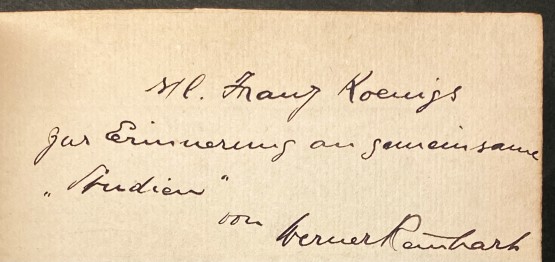 * Voorin een handgeschreven opdracht van Werner Reinhart (1884-1952), industrieel en maecenas uit Winterthur (Zwitserland), gedateerd ‘Weihnachten 1912’ aan Franz Koenigs (1881-1941), bankier en kunstverzamelaar, die tevens een kostbare bibliotheek aanlegde. Koenigs deed zaken met en in Nederland en vestigde zich in Haarlem. Financiële perikelen en schimmige transacties met nazifiguren brachten Koenigs en zijn kunstverzameling in het nauw. Het gevolg was een hopeloos over verschillende musea verdeelde verzameling (Boymans, maar ook het Pushkin-museum in Moskou). Koenigs zelf kwam bij een mysterieus ongeluk om het leven.