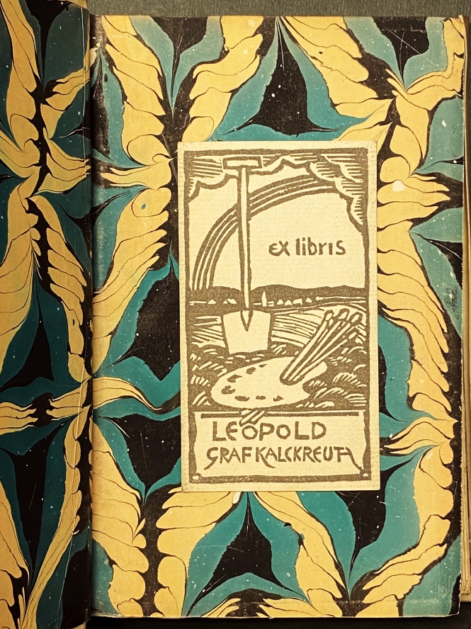 * Luxueus, speciaal ingebonden boek. Met los inliggend exlibris van de impressionistische schilder Leopold Graf Kalckreuth (1855-1928). Deze was de schoonvader van Franz Koenigs (1881-1941), bankier en kunstverzamelaar, die tevens een kostbare bibliotheek aanlegde. Het is niet onwaarschijnlijk dat dit boek (het is afkomstig uit hetzelfde antiquariaat als het vorige) eveneens uit de verzameling van Franz Koenigs en zijn vrouw Anna Gräfin Kalckreuth stamt.