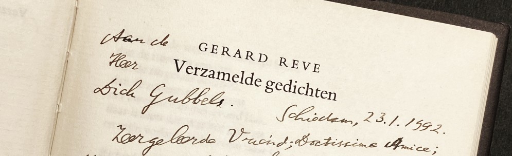 * Exemplaar met twaalf correcties van Reve in kroontjespen ten behoeve van de herdruk van Veen in 1992. Met een handgeschreven opdracht annex brief van Reve op de titelpagina: ‘Aan de Heer Dick Gubbels. Schiedam, 23.1.1992. Zeergeleerde Vriend; Doctissime Amice; In dit exemplaar gelieve je de voorlopige eerste correcties aan te treffen. Enkele zijn mijn schuld, de rest aan de firma te wijten, aan welke ik zo dom was de door mij gecorrigeerde revisie (tweede) proef toe te vertrouwen. Moedig voorwaarts! Als immer je Gerard Reve.’, gevolgd door de paginanummers met correcties. Soms betreft het kennelijke zetfouten (‘sluiter’ moet ‘sluier’ zijn in het gedicht ‘Eind goed, al goed’), soms zijn het inhoudelijke correcties. Dick Gubbels was jarenlang directeur van uitgeverij Veen en in die periode 18 jaar de uitgever van Reve. Toen Gubbels in 2000 met pensioen ging, was dat voor Reve aanleiding om de uitgeverij te verlaten. Museaal, ook al!