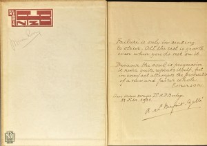 * Bijzondere provenance: met handgeschreven opdracht van het echtpaar Anna en Louis Bienfait ‘Aan onzen zwager Dr. H.P. Berlage/ 21 Febr. 1931’. Dat is de 75e verjaardag van Berlage. De opdracht bestaat uit een zevenregelig Engelstalig citaat van R.W. Emerson, keurig uitgeschreven: ‘Failure is only in ceasing/ to strive. All the rest is growth, (…)’. Aan de binnenkant van het voorplat het in paars gedrukte, fraaie exlibris van H.P. Berlage, wellicht door hemzelf ontworpen. Daaronder in potlood de handtekening van Max van Rooy, kleinzoon én biograaf van Berlage.